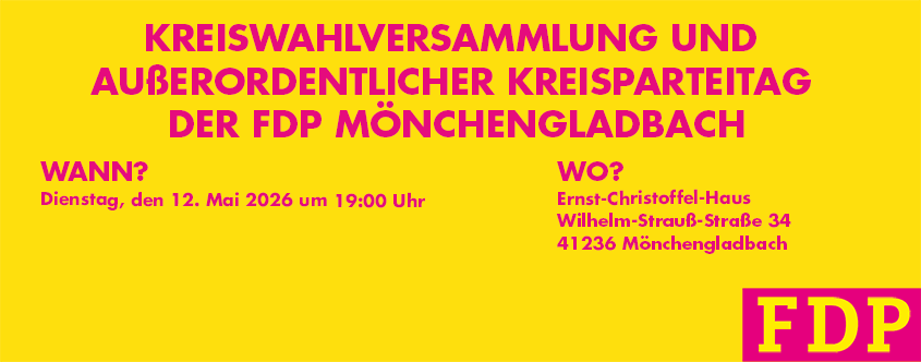 Wir laden Sie herzlich zur Kreiswahlversammlung zur Aufstellung der Bewerber für die Wahl zum 19. Landtag Nordrhein-Westfalen für die Wahlkreise 50, Mönchengladbach I und 51, Mönchengladbach II ein. Im direkten Anschluss laden wir zu einem a.o. Kreisparteitag zur Wahl der Delegierten und Ersatzdelegierten zur Landeswahlversammlung zur Aufstellung der Landesliste zur Landtagswahl ein.