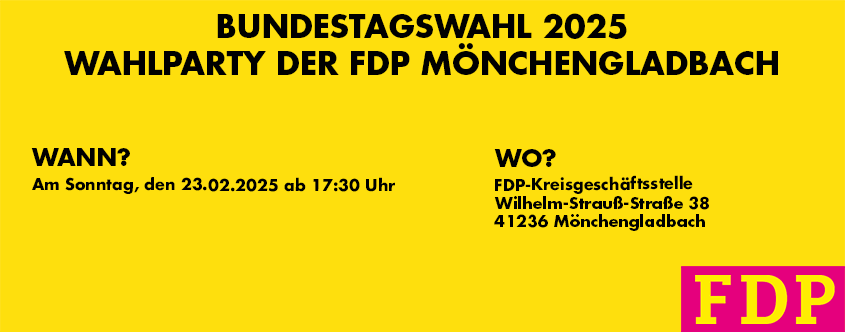 Alles lässt sich ändern, aber eine Tradition bleibt: Am Tag der Bundestagswahl, dem 23. Februar 2025, wird ab 17:30 Uhr unsere Wahlparty dieses Mal wieder in der Kreisgeschäftsstelle (Wilhelm-Strauß-Straße 38, 41236 Mönchengladbach) stattfinden. Wir werden Ihnen die Hochrechnungen und Wahlergebnisse auf dem Bildschirm präsentieren. Für Ihr leibliches Wohl ist gesorgt.