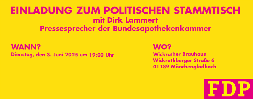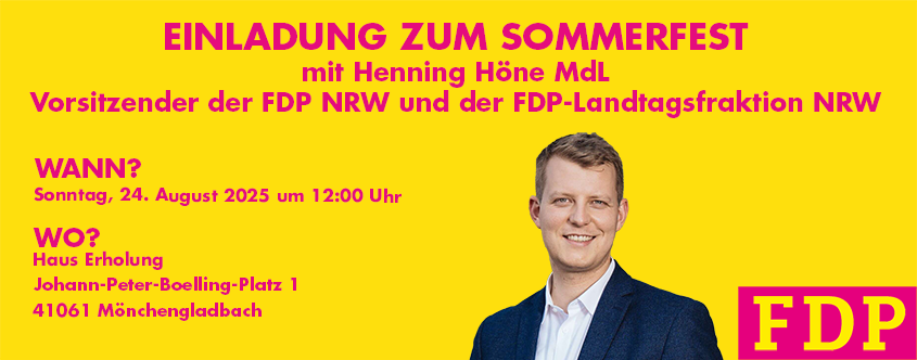 Haus Erholung Johann-Peter-Boelling-Platz, MönchengladbachWir laden Sie und Ihre Begleitung (Familie) herzlich zu unserem Sommerfest ein. Genießen Sie mit uns in lockerer Atmosphäre das Sommerfest im Haus Erholung. Das Sommerfest ist eine ausgezeichnete Gelegenheit, um sich mit anderen Mitgliedern, Unterstützern und Freunden der FDP Mönchengladbach zu vernetzen und interessante Gespräche zu führen. Als Gastredner dürfen wir Henning Höne MdL, […]